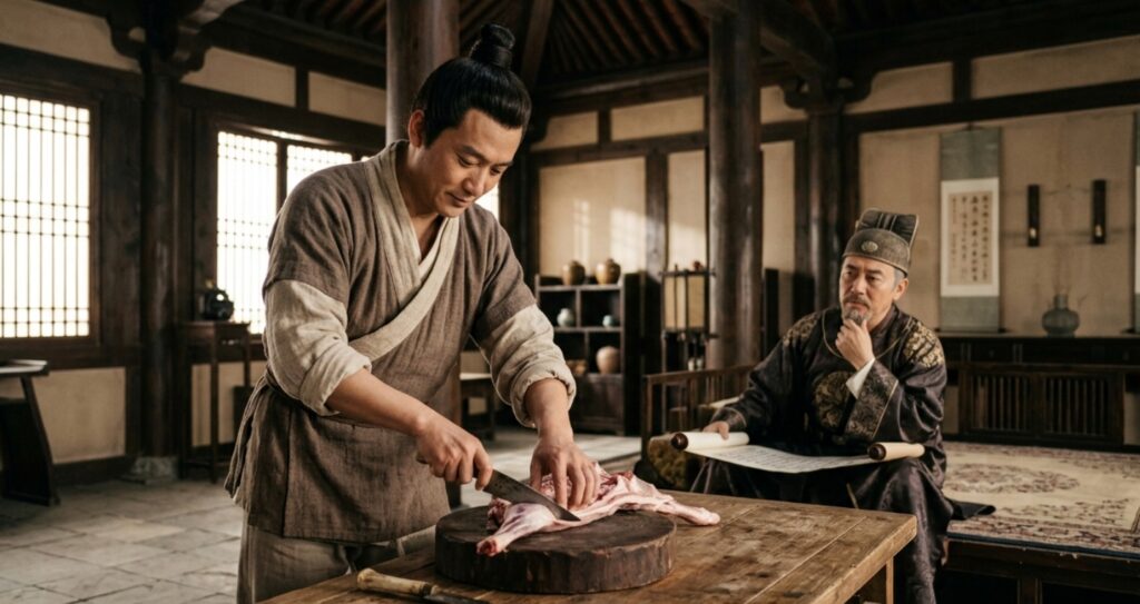 장자에 따르면 위(魏)나라 문혜군(文惠君) 앞에서 한 포정(庖丁)이 소를 잡아 해체했다. 그의 손과 어깨, 무릎과 발놀림은 마치 춤을 추듯 자연스러웠고, 칼이 들어가는 소리조차 음악의 장단처럼 들렸다. 군주가 그 솜씨에 감탄하자 포정은 자신이 따르는 것은 기술이 아니라 도(道)라고 답한다. 처음 소를 잡을 때는 눈앞에 덩어리로만 보이던 것이, 오랜 세월을 거치면서 뼈와 힘줄, 관절과 빈틈의 구조로 보이기 시작했다는 것이다. 마침내 그는 눈으로만 자르지 않고, 대상의 결을 따라 칼을 움직이게 되었다고 말한다.